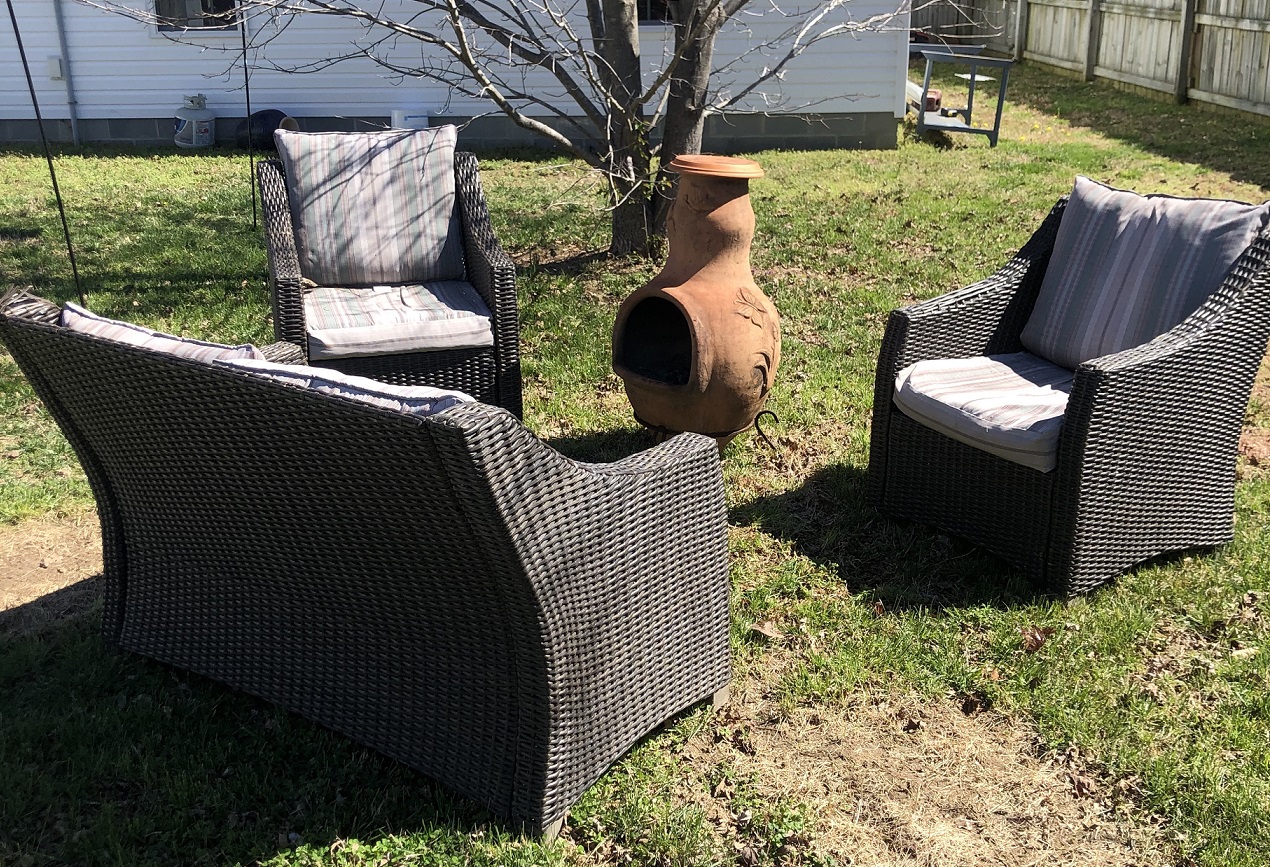 I have had, what I call, my conversation pit in the backyard for 2 years with our old deck furniture. Works out great for conversating, but it is a pain in the ass to move things to mow. I shift things around to mow around/under and then I don’t move them back so there are dead spots in the yard which never recover. Here is a look at the conversation pit prior to the upgrade, you can see the dead spots in the grass.